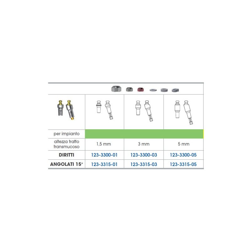 permanente guiderà il clinico nel posizionamento sul paziente con la massima precisione. I monconi a testa sferica per overdenture sono disponibili nella piattaforma protesica Standard solo per impianti Ø3,3 mm e Ø3,75 mm (diametro di connessione verde) e per impianti Ø4,1 mm, Ø4,5 mm e EXACONE® 6.5 (diametro di connessione giallo) con le altezze del tratto transmucoso di 1,5 - 3 - 5 mm. In abbinamento a tali monconi sono state realizzate delle cappette ritentive in elastomero ad aggancio sferico di diverse rigidezze, in modo da fornire un tipo di stabilizzazione della protesi mobile alternativo ai tradizionali O-Ring per overdenture.