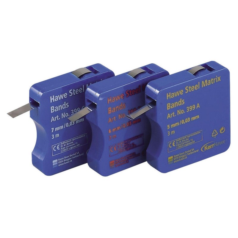 Matrice a nastro in acciaio, larghezza da 5 a 7 mm. spessore 0,030 e 0,045 mm. - lunghezza 3 mt. serie 399 e 499 Kerr Hawe